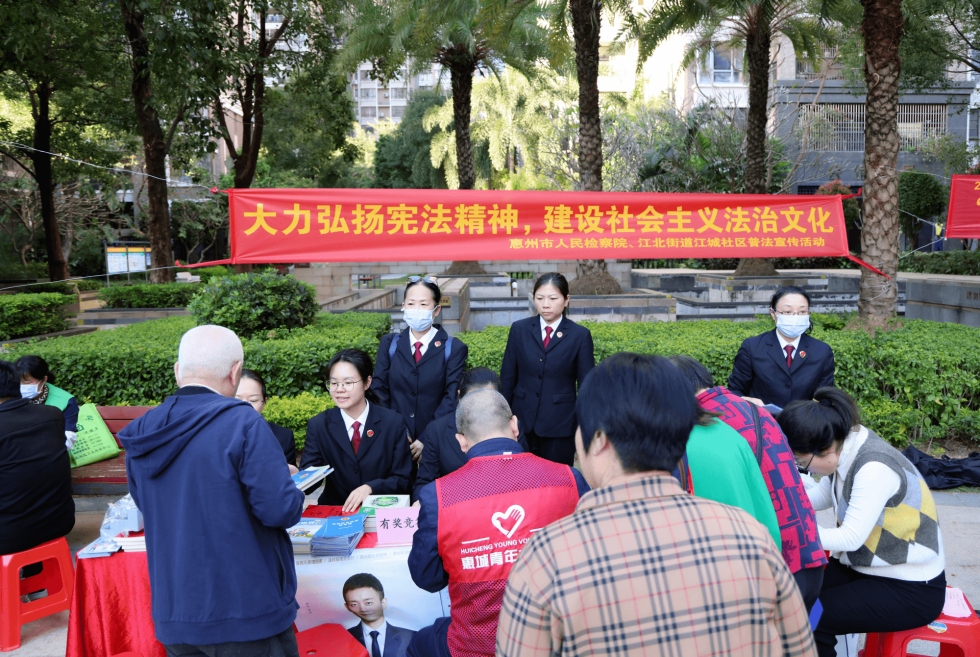12月7日,惠州市检察院组织干警来到惠城区江城社区开展宪法宣传活动。活动期间,检察干警们以群众关心的法律问题为切入点,通过法律宣讲、法律咨询、派发宣传手册等形式,向小区居民宣传关于习近平法治思想、宪法、防电信诈骗、防养老诈骗、未成年人保护、民事行政检察、公益诉讼检察等法律知识,耐心解答居民朋友遇到的法律问题,深入了解居民的法治需求。现场设置了公益诉讼检察知识展板,由检察干警担任讲解员向现场居民宣传公益保护法律知识。现场法律知识竞答环节更是吸引了众多居民参与活动,有效引导广大居民群众共同养成尊崇宪法和懂法学法尊法用法的良好习惯,进一步推进基层依法治理。此次宪法法治宣传共发放各类宣传资料500多份,接收群众法律咨询50人次,80余人参加了法律知识竞答。