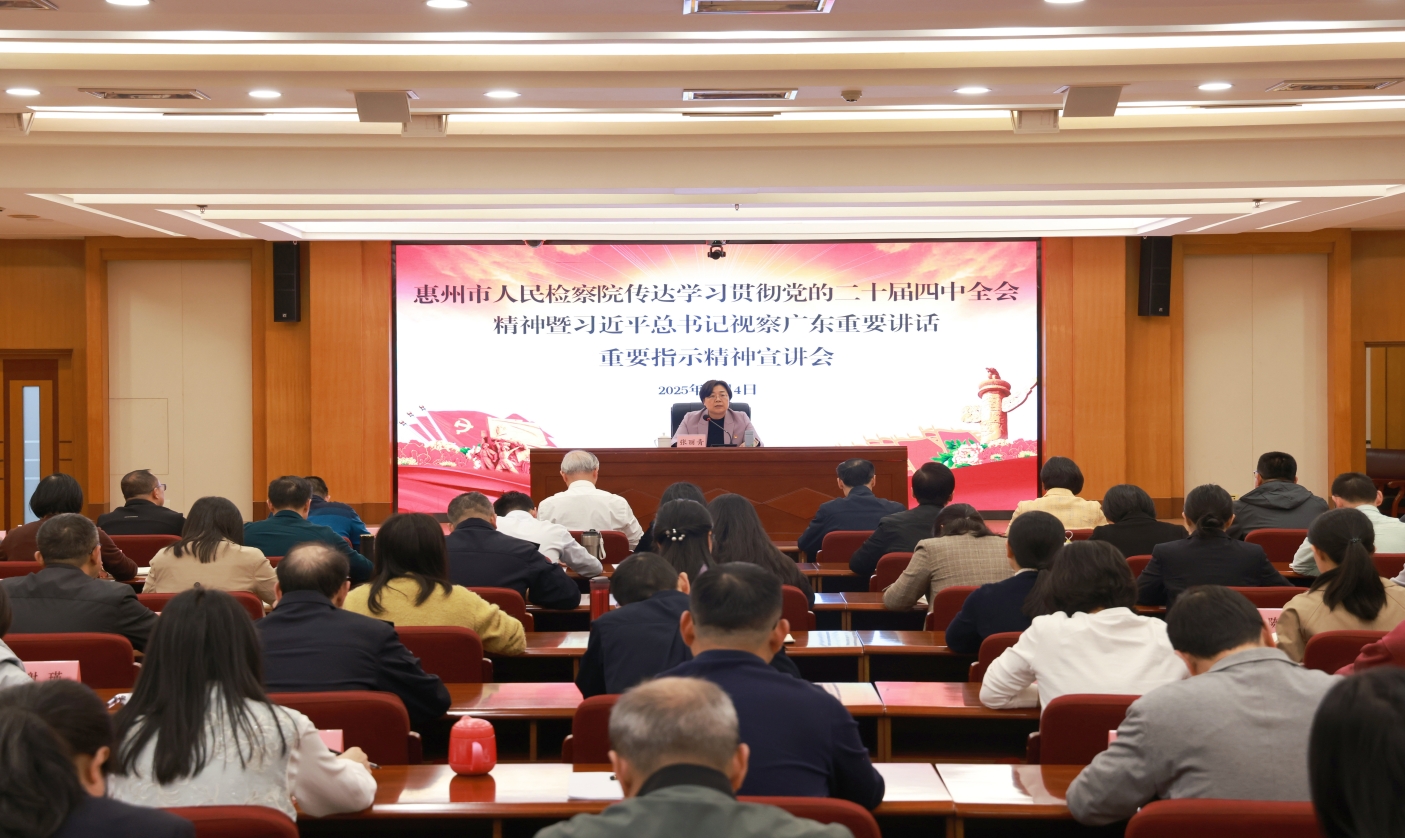 12月4日,惠州市人民检察院举行传达学习贯彻党的二十届四中全会精神及习近平总书记视察广东重要讲话重要指示精神宣讲会。惠州市委宣讲团成员,市人民检察院党组书记、检察长张丽青作专题宣讲。