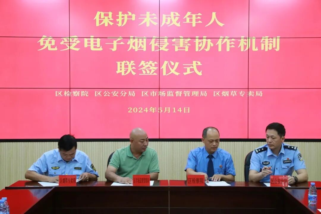 为严厉打击涉电子烟违法犯罪,切实保护未成年人身心健康,近日,惠阳区人民检察院与区公安分局、区市场监督管理局、区烟草专卖局针对保护未成年人免受电子烟侵害召开工作交流会。惠阳区检察院、区公安分局、区市场监督管理局、区烟草专卖局等单位相关领导参会,就辖区内未成年人涉电子烟情况等问题进行探讨交流。 会上,惠阳区检察院结合近两年该院办理的未成年人涉依托咪酯电子烟案件情况,向参会人员介绍了涉案未成年人吸食依托咪酯电子烟的危害、特征、原因及跟踪帮教工作中存在的问题等,希望各部门对未成年人吸食依托咪酯电子烟的情况引起重视,共商强化监管、联合整治、综合保护等措施,以期构建打击、治理、保护职能于一体的联动工作机制。 与会代表就未成年人吸食电子烟乃至含有依托咪酯等新型毒品的电子烟进行深入研讨,并就多维协作联动保护未成年人免受电子烟侵害达成共识。随后,惠阳区检察院牵头与区公安分局、区市场监督管理局、区烟草专卖局共同签署《保护未成年人免受电子烟侵害协作机制》。 该机制旨在通过畅通线索移送渠道、定期召开联席会议等强化各职能部门在工作中的协作配合,开展保护未成年人免受电子烟侵害的专项行动,进一步加强对惠阳区电子烟行业的有效监管,杜绝未成年人吸食电子烟的行为,为未成年人营造健康成长的社会环境。 下来,惠阳区检察院将不断深入落实未成年人保护工作,依托该联签机制,积极联动各部门严厉打击未成年人涉依托咪酯电子烟的违法犯罪行为、定期开展多形式的法治宣传教育等形成预防未成年人涉电子烟工作大格局,为未成年人的身心健康提供法治保障。