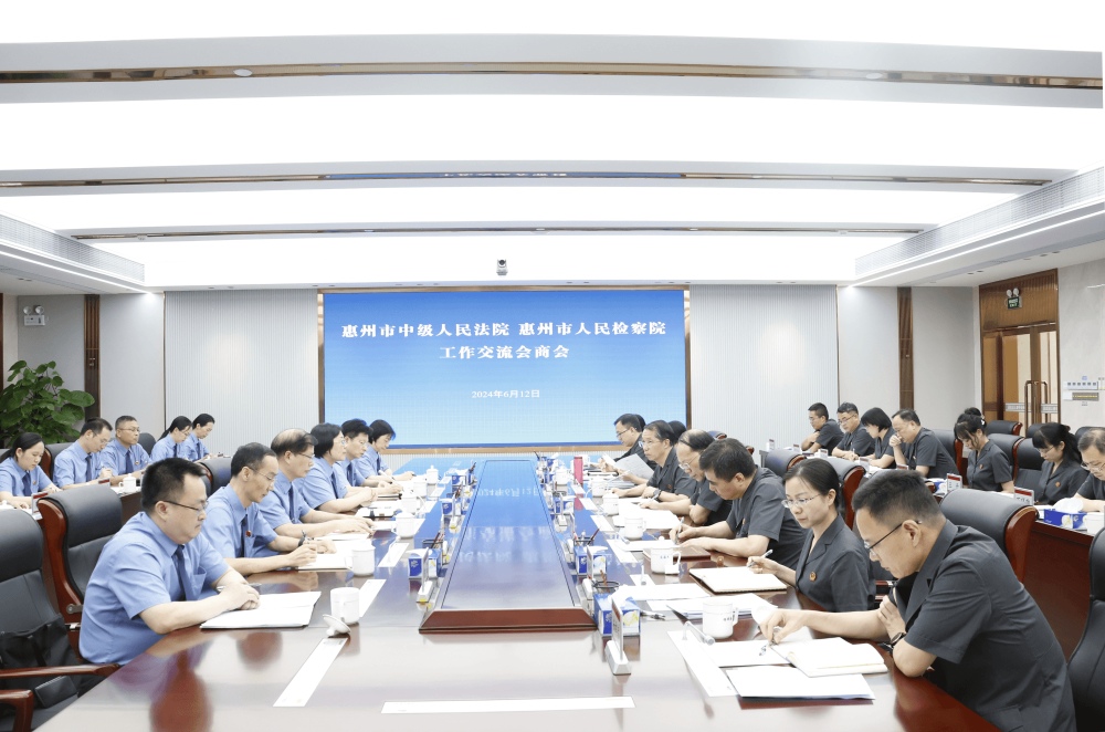 6月12日,惠州市中级人民法院与惠州市人民检察院召开工作交流会商会,建立常态化交流会商机制,进一步深化法检良性互动、凝聚法治合力。市中级法院党组书记、院长朱可胜,市检察院党组书记张丽青出席会议并讲话。