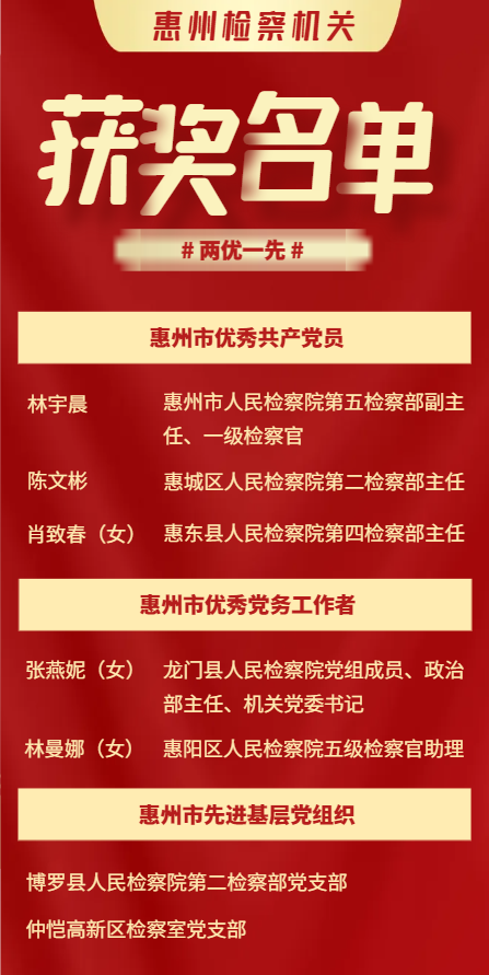 近年来,全市各级党组织和广大党员坚持以习近平新时代中国特色社会主义思想为指导,全面贯彻落实党的二十大、二十届二中全会精神和习近平总书记视察广东重要讲话、重要指示精神,深入落实省委“1310”具体部署及市委、市政府各项工作要求,坚定信心、实干担当,知重负重、勇毅前行,奋力打造广东高质量发展新增长极,推动全市经济社会各项事业取得新进步。特别是在开展学习贯彻习近平新时代中国特色社会主义思想主题教育,推进“百县千镇万村高质量发展工程”,坚持实体经济为本、制造业当家,推进绿美惠州生态建设,乡村振兴和基层治理等重点工作中,充分发挥基层党组织战斗堡垒作用和党员先锋模范作用,展示了新时代共产党人的良好形象和精神风貌,彰显了鲜明的时代特征和惠州特色,涌现出一大批政治坚定、敢于担当、成绩显著、贡献突出的先进集体和优秀个人。