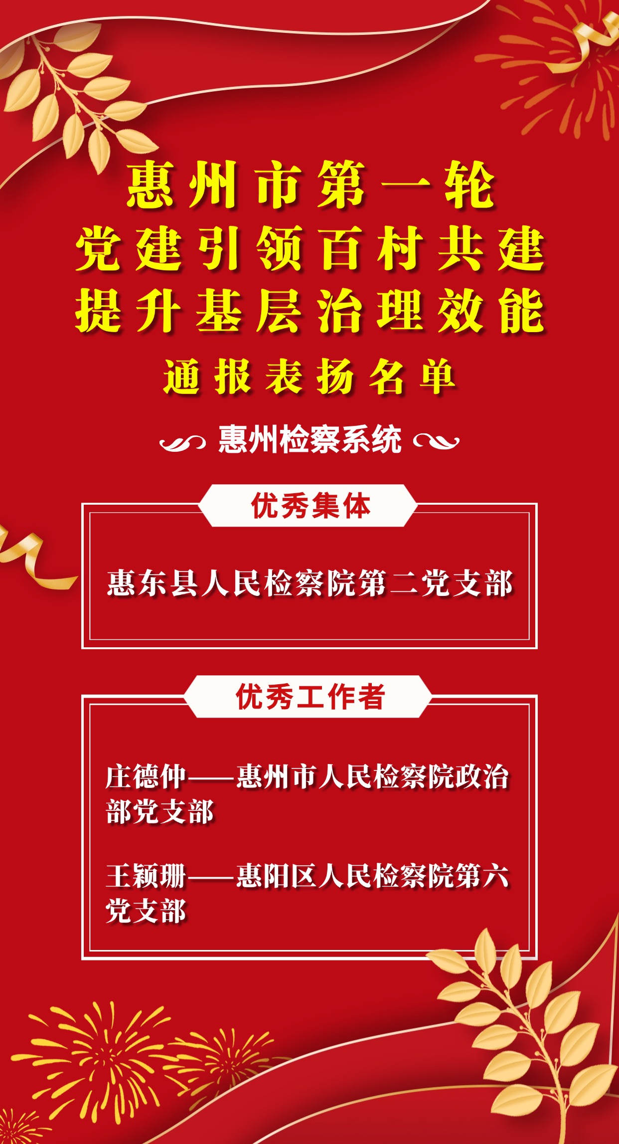 近日,惠州市委组织部、市委政法委联合印发决定,通报表扬惠州市第一轮“党建引领百村共建 提升基层治理效能”优秀集体和优秀工作者,其中惠东县人民检察院第二党支部荣获“优秀集体”称号,2名检察干警因兼任结对村党组织副书记成效显著被评为“优秀工作者”。
