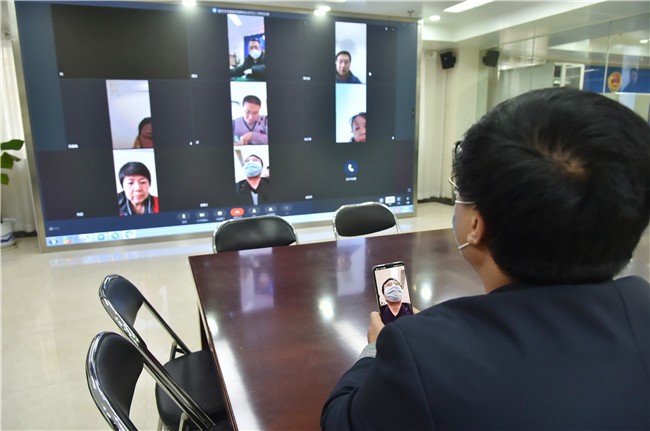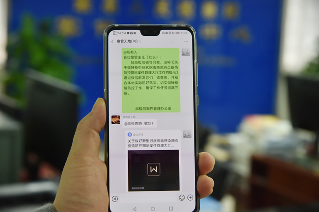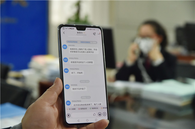 疫情限制了人们出行的脚步,却限制不了人们的交流。案管办严格按照《高检院关于防疫新型冠状病毒肺炎的办法》的规定,要求返京人员自行在家隔离14天,但由此带来的问题是该办一半以上的工作人员需居家隔离。针对这个实际,案管办积极采用办公软件开展工作,在线办公已成为一种新常态。一位受访的工作人员认为,这种工作方式不但方便工作开展,还能相互加油鼓劲,克服对疫情的恐惧心理。图为工作人员运用“钉钉”开视频会,对疫情防控和办案工作进行再部署。