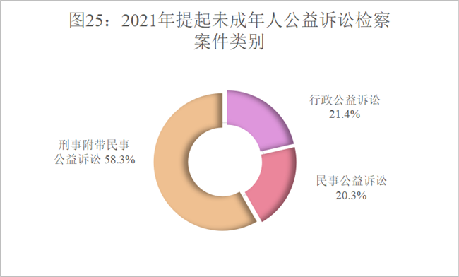 (4)提起公益诉讼情况。检察机关提起未成年人保护公益诉讼84件,同比上升2.2倍。其中,提起行政公益诉讼18件,提起民事公益诉讼17件,提起刑事附带民事公益诉讼49件。